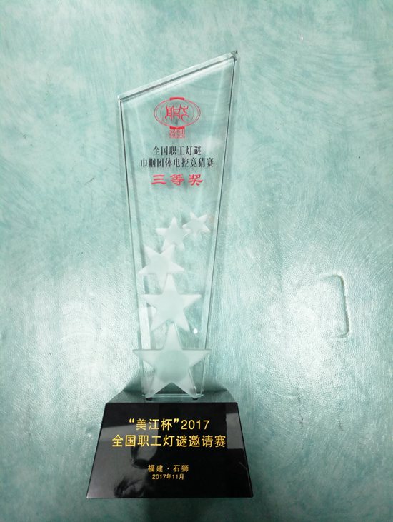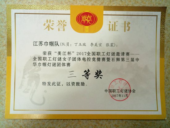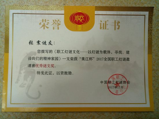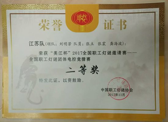 我校春來謎社常務(wù)副社長、秘書長張震應(yīng)邀參賽,喜獲佳績!代表江蘇隊參加全國職工燈謎團(tuán)體電控競猜賽,榮獲二等獎;代表江蘇巾幗隊參加全國職工燈謎女子團(tuán)體電控競猜賽,榮獲三等獎;論文《職工燈謎文化——以燈謎為載體,尋找、建設(shè)我們的精神家園》榮獲“美江杯”2017全國職工燈謎邀請賽優(yōu)秀謎文獎(共十佳)。