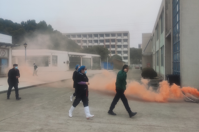 2月27日下午演練開始,緊接著煙霧彈燃燒,警報(bào)響起,預(yù)設(shè)地點(diǎn)發(fā)生火情,食堂、宿舍、超市員工按指定路線快速疏散到集合地點(diǎn)。