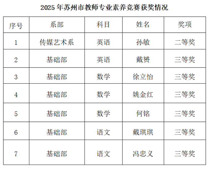 蘇州市教師專業素養競賽,是蘇州市教育科學研究院組織的以“助推教師專業素養發展、提升教師專業能力水平”為目標開展的教師專項競賽活動。近日,2025年蘇州市教師專業素養競賽成績揭曉,常熟中專校教師喜獲佳績。本次競賽涉及語文、數學、英語三門學科,我校共有31名教師參賽,7名教師獲獎。其中,孫敏老師奪得二等獎,戴赟、徐立怡、姚金紅、何銘、戴琪琪、馮忠義老師獲得三等獎。